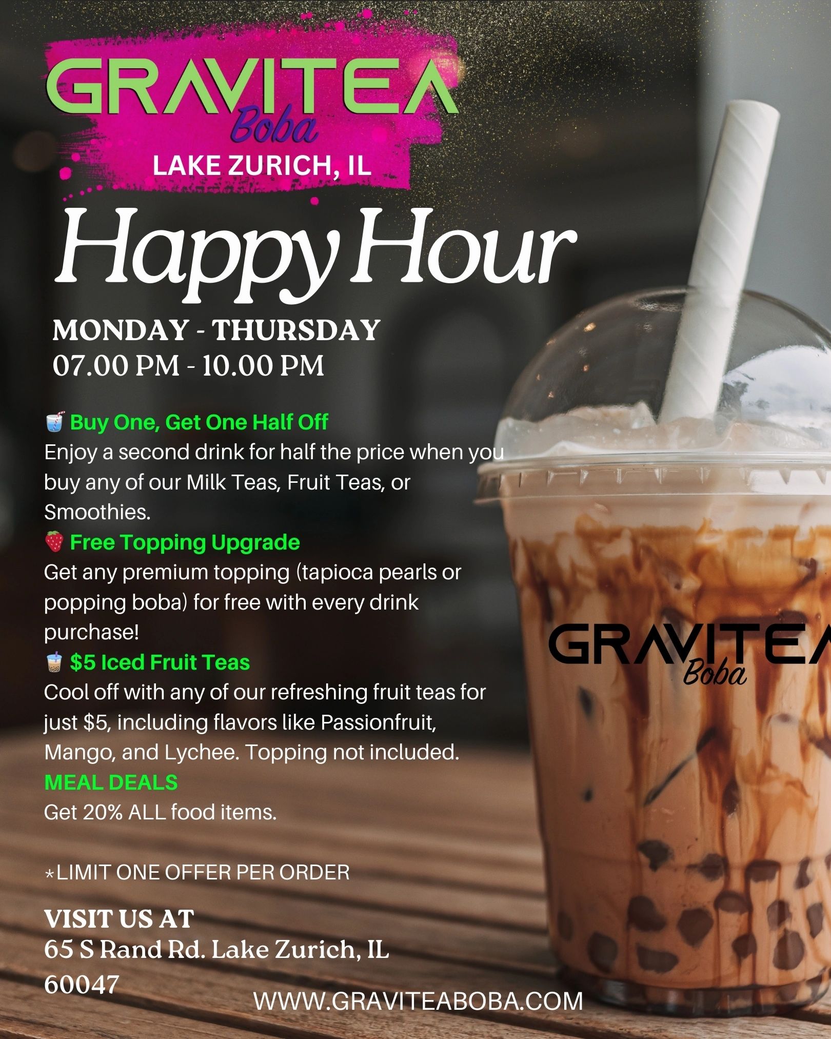 Gravitea Boba reserves the right to modify, extend, or discontinue any Happy Hour offers at any time without prior notice. Additional restrictions may apply.
